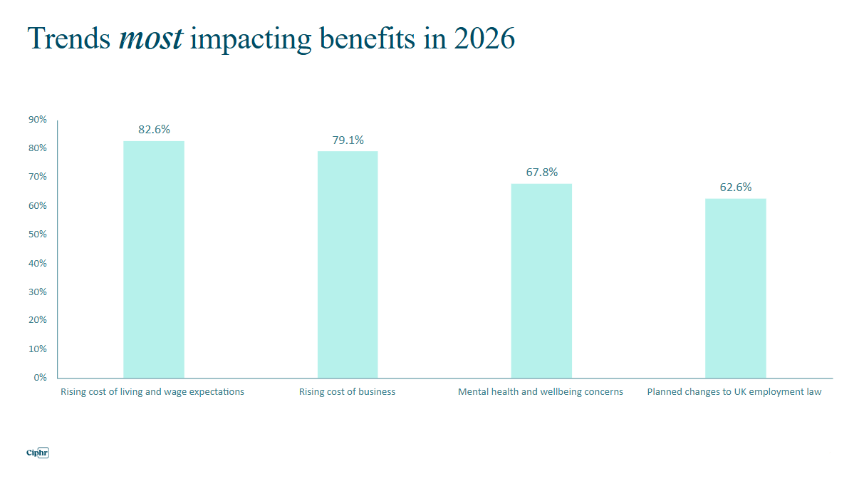 Unsurprisingly, cost pressures dominate – but they’re far from the only concern. Respondents told us that these trends will have the greatest impact on benefits teams in 2026: